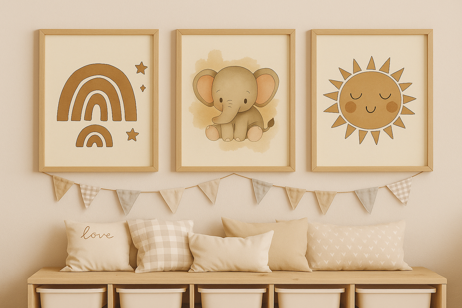 Add a touch of sunshine to your little one’s space with our Boho Rainbow Print, Sun and Elephant Print 🌞