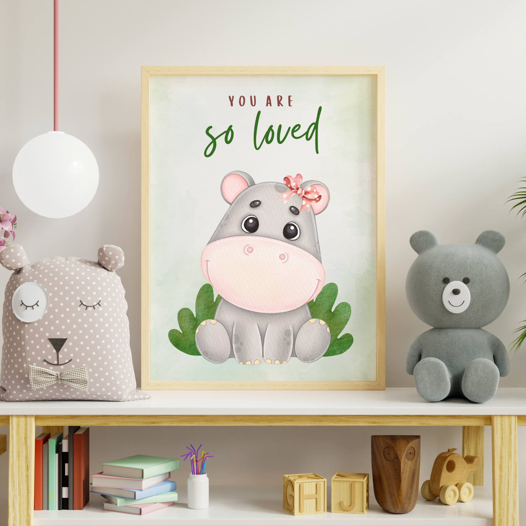 Celebrate your little one's world with the "You Are So Loved" hippo nursery decor. This charming design brings warmth and joy to any baby’s space, reminding them of the endless love that surrounds them. Perfect for adding a playful touch to the nursery, it creates a cozy and cheerful atmosphere where sweet dreams and happy moments blossom.